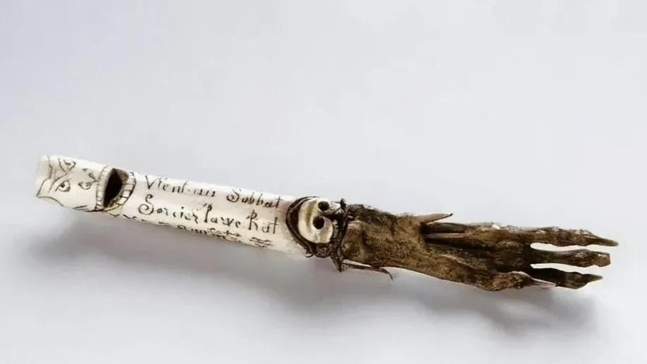 十七,19世纪比利时人发明的一种驱鼠巫哨,外形酷似骷髅,有头骨制成,看起来让人毛骨悚然。