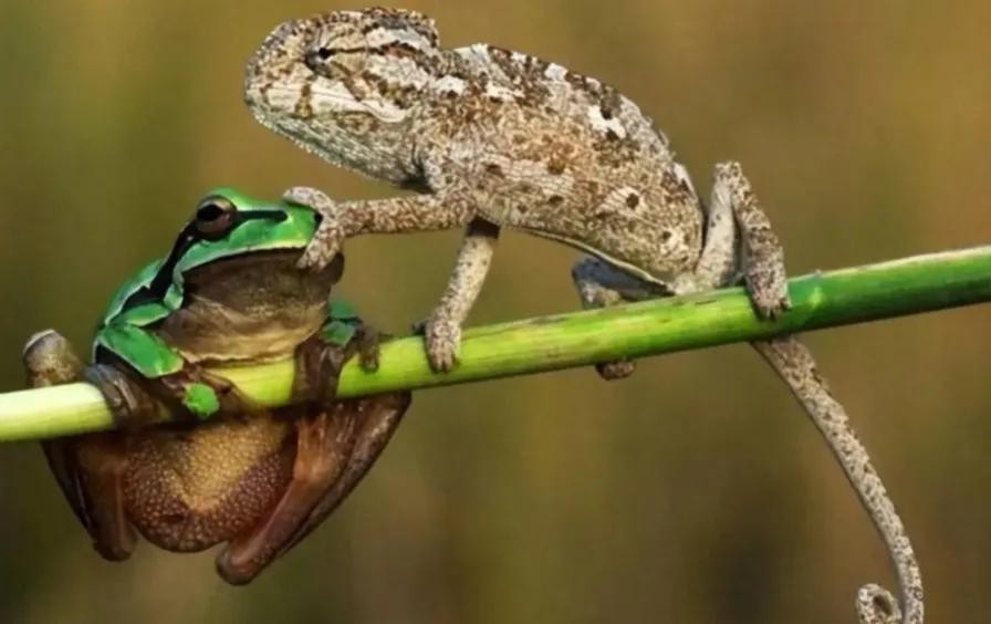 十一,一只变色龙在河边觅食,遇见了一只话唠青蛙,结果直接给它来个瞬间静音模式。