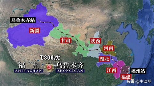 T306次列车运行线路图:福州开往新疆乌鲁木齐,全程4334公里