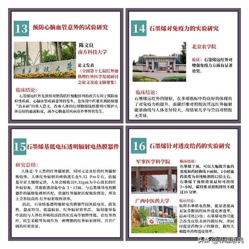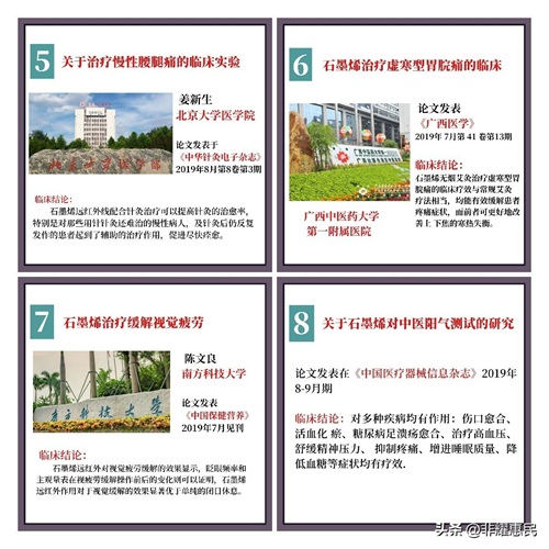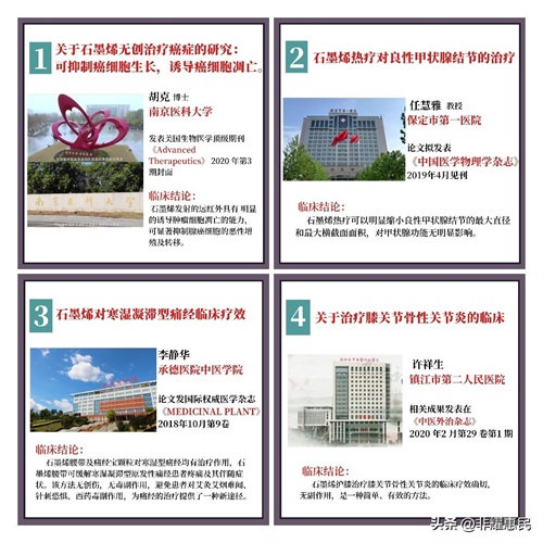 从2018年开始,一些医院和研究者开始用石墨烯做临床试验,都取得了不少的进展。对于常见的寒湿引起的疼痛、腰腿痛、胃痛、失眠、高血压、糖尿病、甚至肿瘤化疗等都陆续开展了研究。
