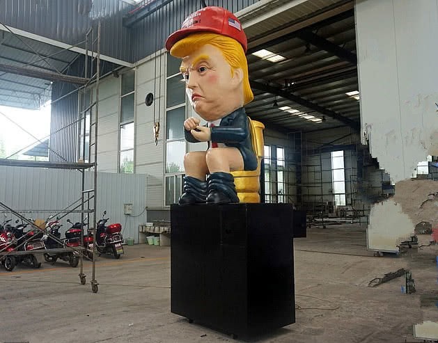 英国《每日邮报》5月31日报道,随着数千人计划游行抗议特朗普的访问,这个手持手机、穿着尿布的气球娃娃可能会在周二再在伦敦升起,另外一个坐在黄金马桶上的特朗普雕像也已经运抵英国,静待特朗普的到来。
