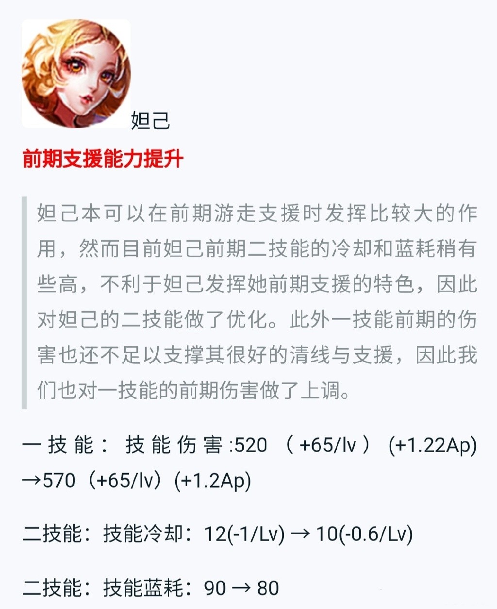 在此次调整中为数不多加强的英雄就是铠和妲己。妲己加强了前期的支援效果,而铠的一技能前期伤害提升,大招格挡效果提升,对于其前期清线支援是一次加强,团战生存能力也加强,这两个英雄胜率估计会有所提升。