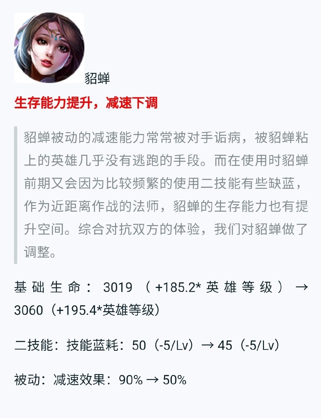 首先就是英雄调整,第一个要提到的就是貂蝉。可能是因为貂蝉最近被大家讨论得比较多,官方也觉得强度确实有一些超标,所以降低了貂蝉的生命值,同时降低了二技能的减速效果,这意味着貂蝉追着对手打的能力降低了,可能胜率也会降低。