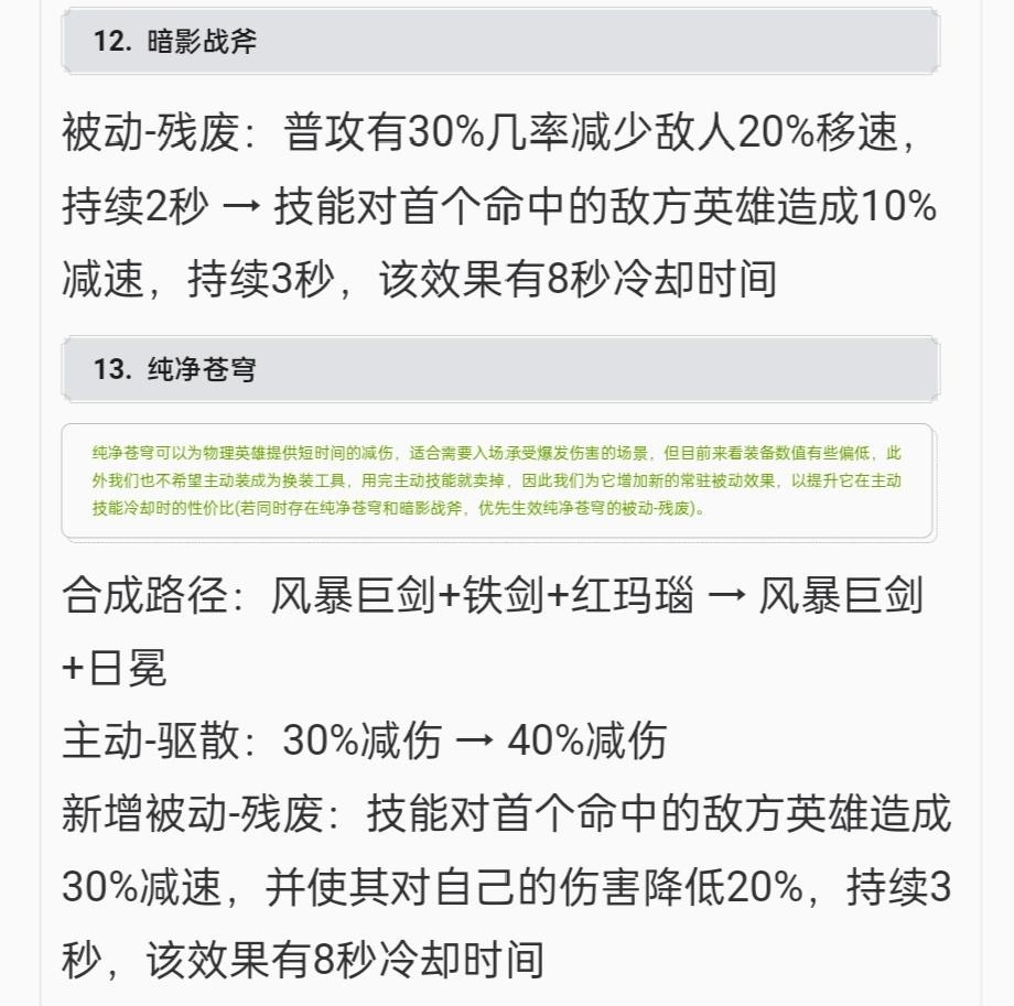 同时装备也有更新,纯净苍穹和暗影战斧新增了减速和减伤效果,对于战士来说是很不错的装备,想必对对线有不小的影响。