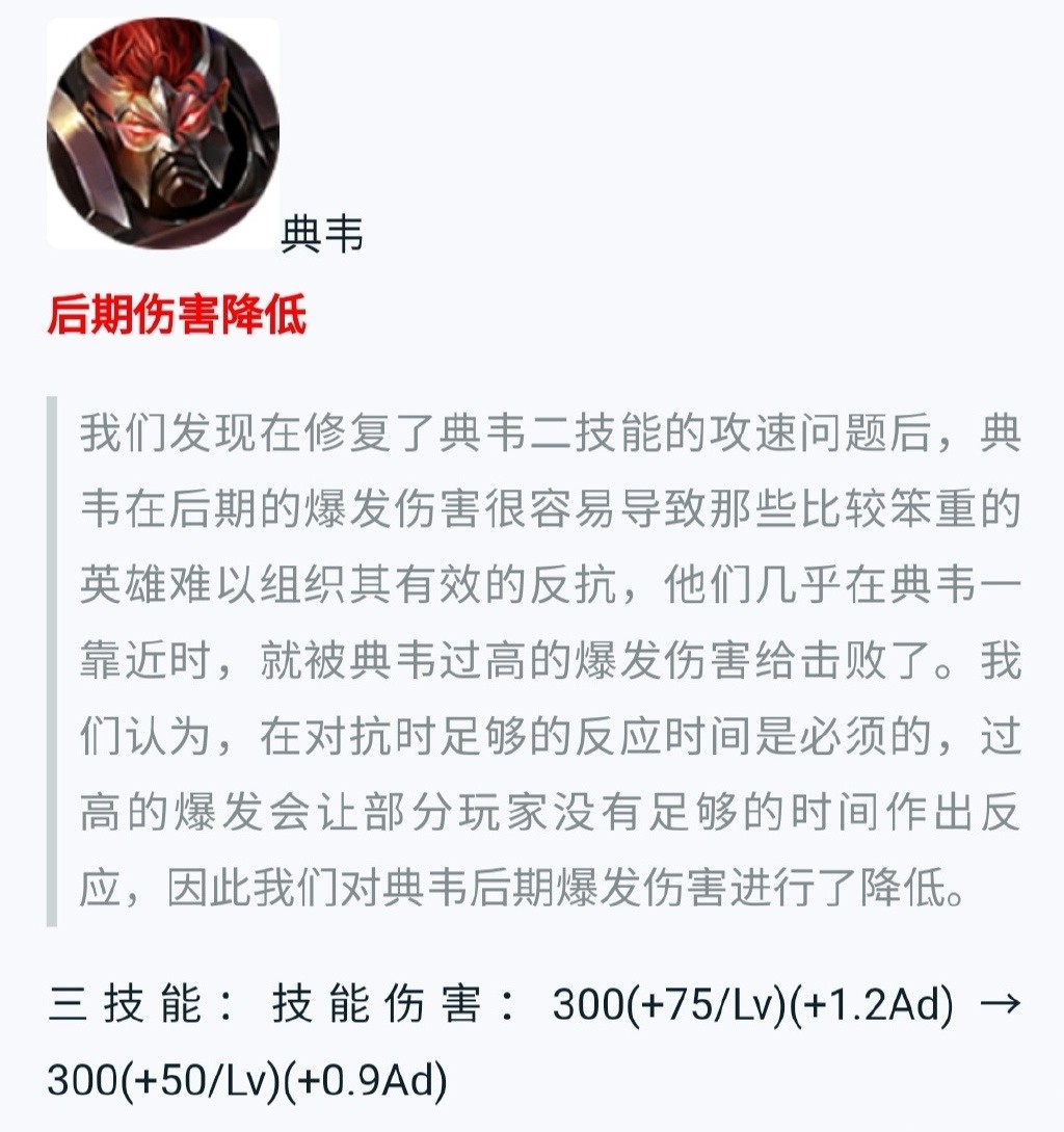 典韦因为伤害高还能解控所以最近一直在英雄胜率榜第一位,无论是官方还是玩家都吐槽强度超标。所以在这次调整当中降低了典韦大招的伤害,不会再造成大招踩一脚就半血的效果,至于具体胜率会降低多少还要再观察。