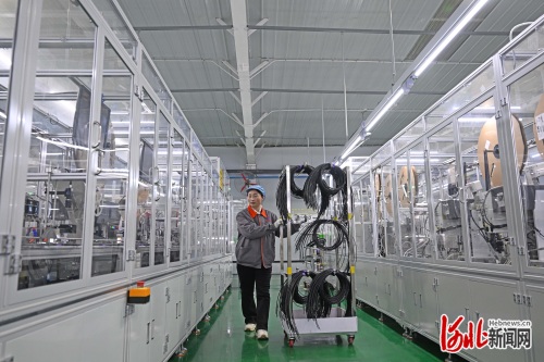 2月20日,在保定市宏腾科技有限公司生产车间,工人在运输半成品高速数据传输线。河北日报记者 张昊摄