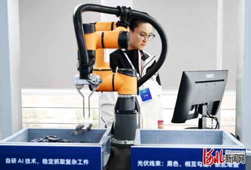 2024年11月28日,雄安新区中关村科技园内,梅卡曼德机器人科技有限公司工作人员在演示“AI+机器人”新产品。(河北日报资料片) 河北日报记者 刘光昱摄