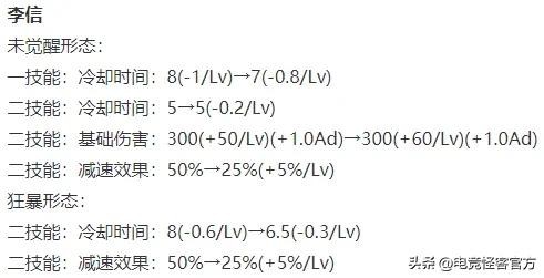 李信未觉醒状态下,二技能减速效果前期对半砍,后期不变;作为补偿,减少了一技能1秒的CD,二技能基础伤害略微提升。