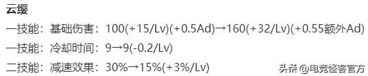 一技能伤害数值有明显增加,但AD加成改为了额外AD加成,一技能CD从固定9秒改为9~8秒。二技能的减速效果前期对半砍,后期不变。