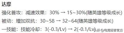 达摩强化普攻的减速效果前期对半砍,后期不变;被动增加双抗增加,一技能的前期CD少了1秒。