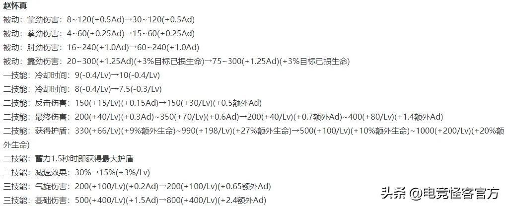 赵怀真的改动数值较多,怪客在这里简单给大家总结一下。首先被动四段普攻的前期伤害基本都有小幅增加,后期不变。