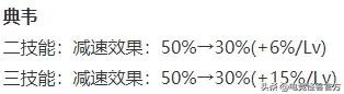 典韦二技能减速效果前期减少到30%,后期二技能满级提升至60%。大招的减速效果改动也是一样,前期削弱,后期加强。