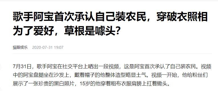 以上信息均来源于猫眼娱乐2020-07-31-歌手阿宝首次承认自己装农民,穿破衣照相为了爱好,草根是噱头?