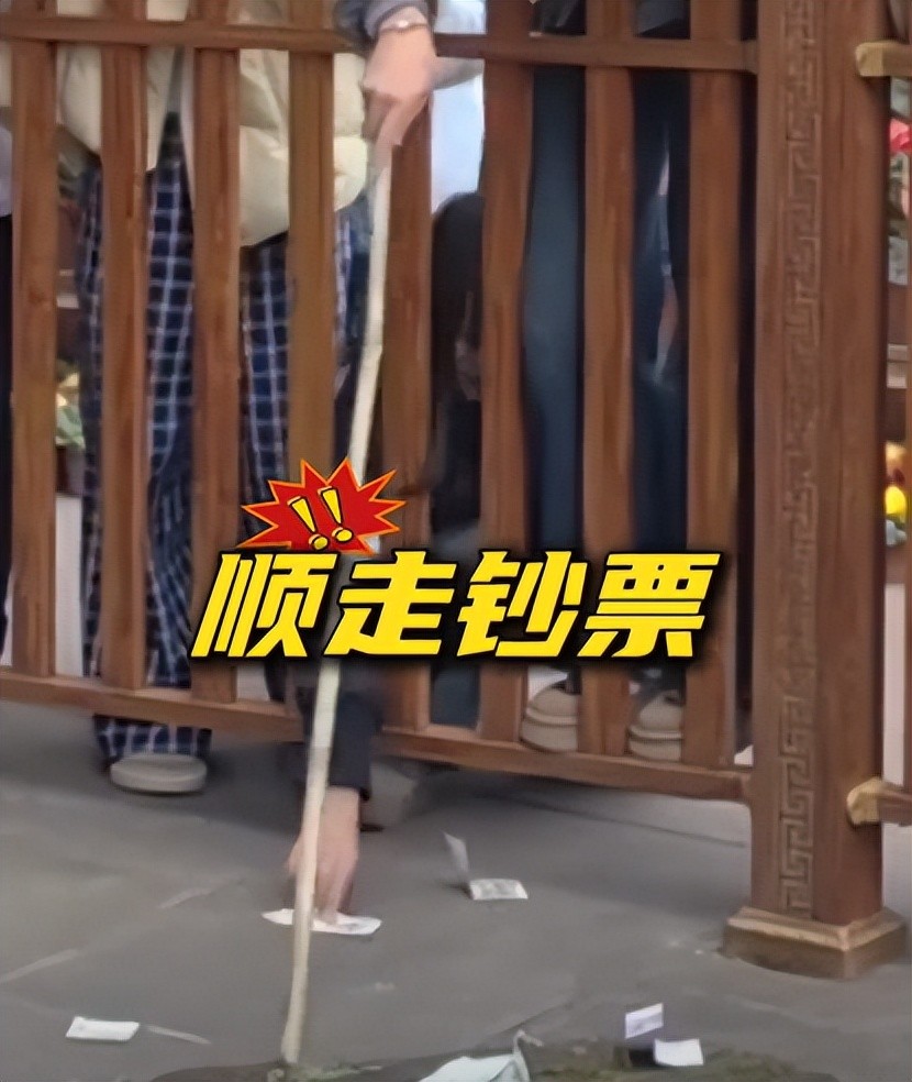 两个女孩还一起翻找,专门挑选面额大的往外划拉,甚至还有百元大钞,灰色衣服的女孩先拿着竹竿翻找,但是看到百元大钞后自己没有够到,于是将竹竿交给黑衣服的女孩,够到钱后就往自己的身边划,然后将钱揣兜里带走。