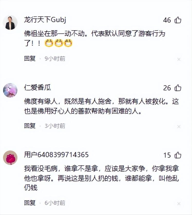 从某种意义上来说,这些人把钱扔出来就是捐给了大佛,而被这两个女生捡走,也就是大佛默许了女生的行为,佛度有缘人,说明女生确实需要这些钱。