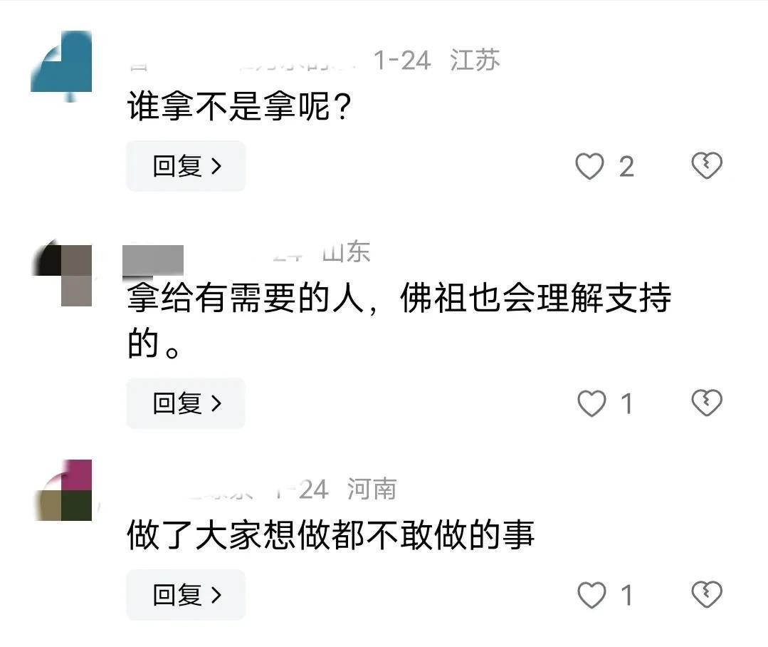 许多网友称往里面扔钱的都是不缺钱的人,还扔百元大钞那更是看不上这点钱了,这两个女生去拿钱就证明她们缺钱,拿出来也没啥毛病。