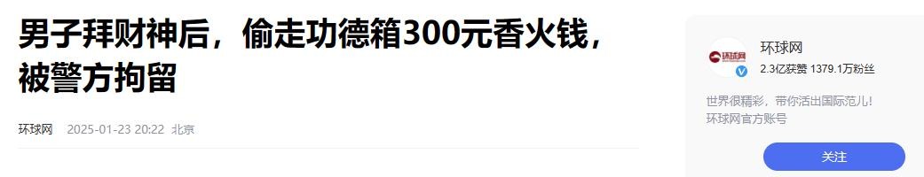 而这两个女生的行为就等于偷拿景区的钱,就属于偷盗行为了,甚至会担负法律责任,这还是有先例的,1月12日的时候,上海一名男子在跪拜财神后,趁没人注意就偷拿其他游客放在功德箱里的香火钱。