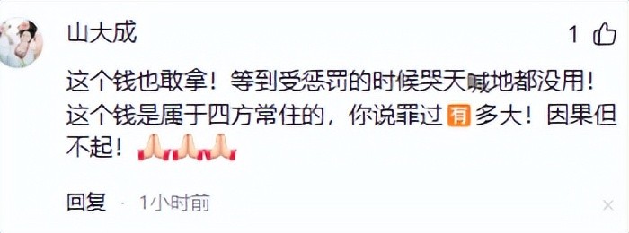 还有网友称,这都是人在做天在看,这俩女生根本就不了解扔大钱的都是啥意思,有句话叫做花钱消灾,扔大钱就是替自己挡灾的,结果灾被这俩女生揣兜里了,真是不怕以后遭到报应。