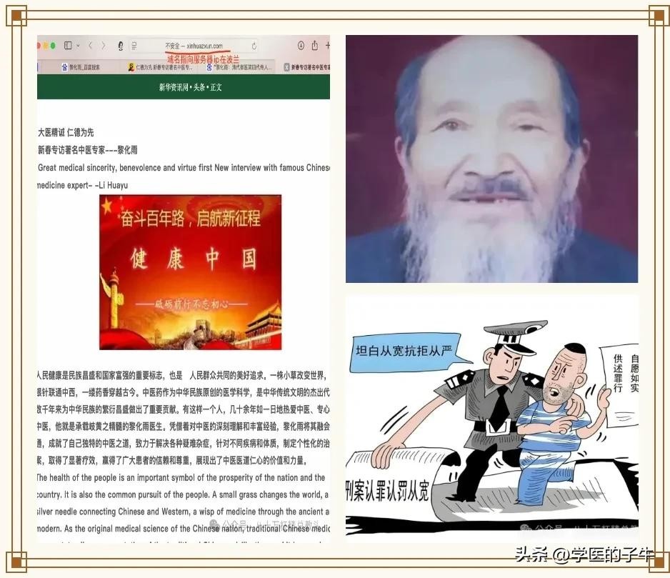 黎化雨构建了一套完整的造假体系,从资格证书到媒体背书环环相扣,形成迷惑性极强的诈骗系统。其宣称是中医师,经过子牛与宁乡市卫健局医政科核对得知,黎化雨并未取得执业医师资格,以前只是一个乡村医生,目前已经退了早已不能行医,现在行医就是非法行医了。
