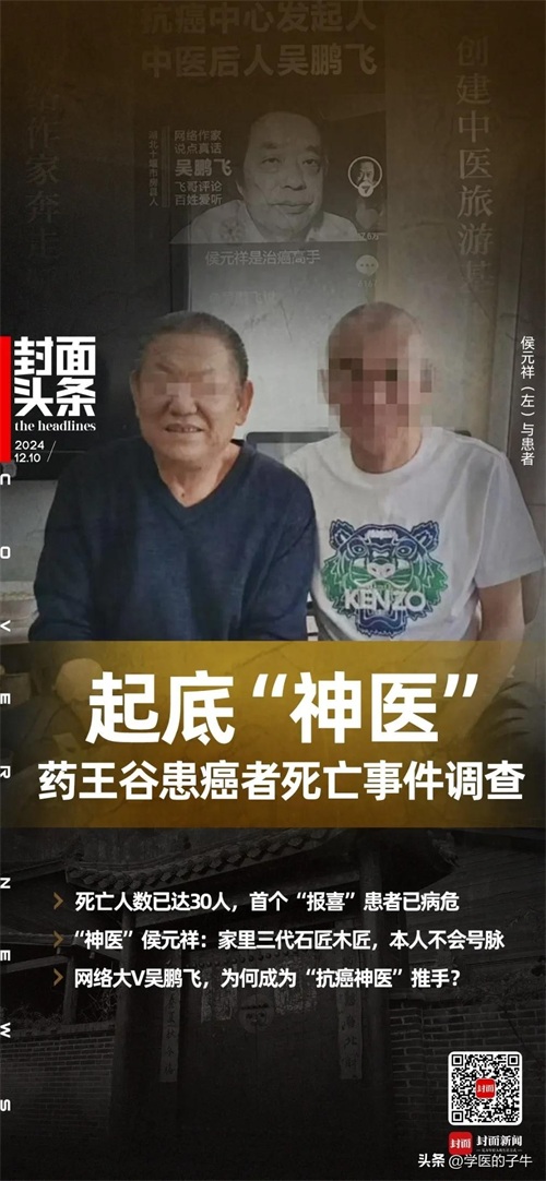 吴鹏飞的武当山药王谷这个严重危害患者生命健康、严重破坏社会医疗秩序、严重损害中医药声誉的重大案件。吴鹏飞通过塑造虚假背景,杜撰侯元祥案件是冤案,并且虚构“司法女干部千万买断侯元祥秘方的桥段,吹嘘侯元祥治疗癌症天下第一,治好了1196人,治愈率80%以上”制造了一尊神医。