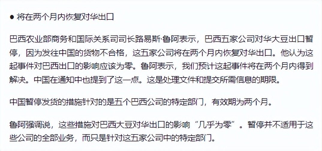 这恐怕也是中国部分暂停巴西大豆进口,会引起关注的重要原因之一,但从当前我们能够掌握的官方信息来看,这样的说法不足为凭。
