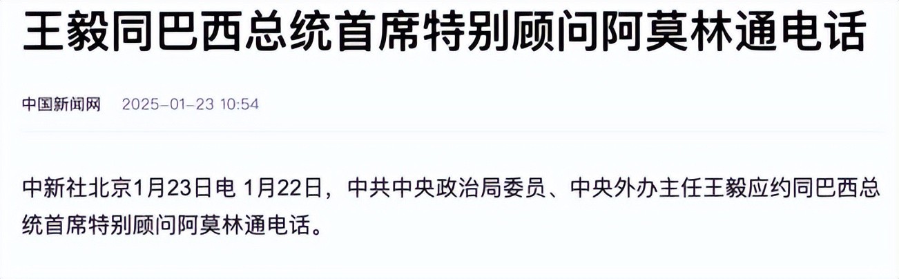 《王毅同巴西总统首席特别顾问阿莫林通电话》2025-01-23 中国新闻网