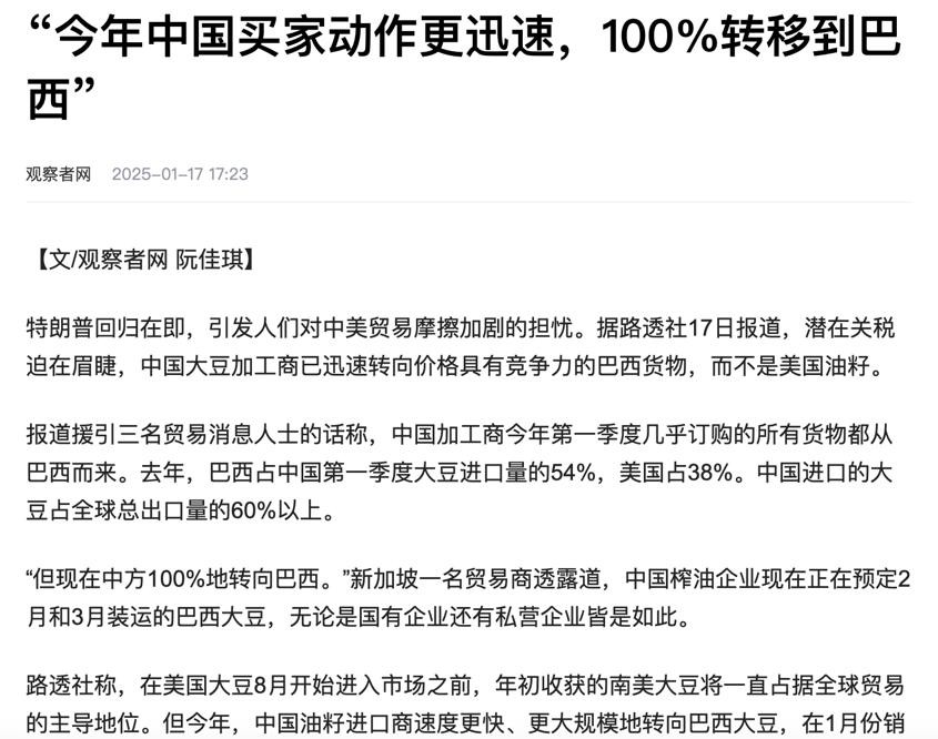 《“今年中国买家动作更迅速,100%转移到巴西”》 2025-01-17观察者网