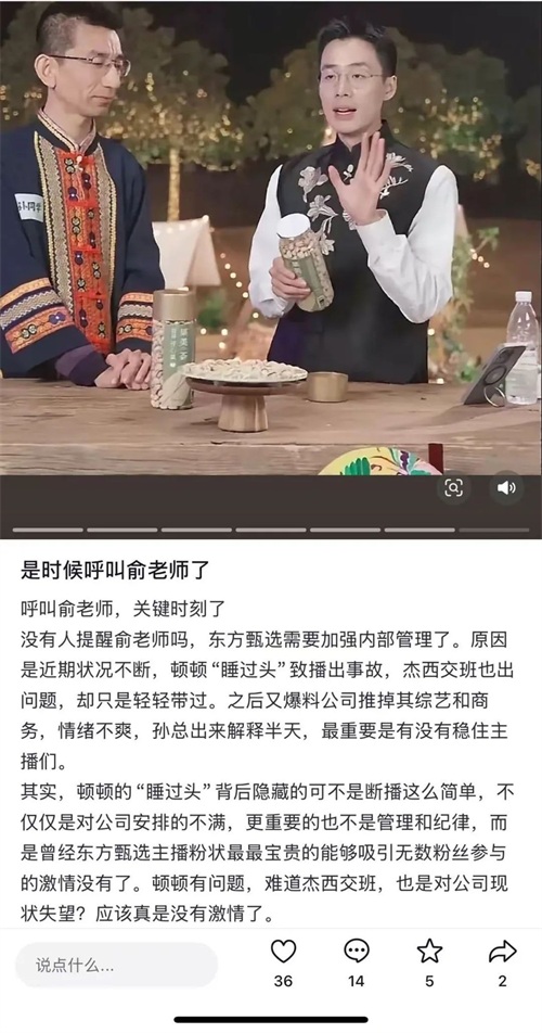 这里还有一个细节:董宇辉之后的主播表现,也有天壤之别。除了主播明明的“山河破碎”、主播天权脱口而出“江小白不是白酒”等业务能力问题,顿顿则是其中把公司管理问题推向公众最多的一个。在东方甄选与董宇辉矛盾最尖锐,但还没有完全挑破的时期,他就在直播吐槽公司的管理,称公司开新账号完全不跟主播商量沟通,出现互联网舆情时公司的公关部门不作为,并直言“这段时间确实有点失望”。