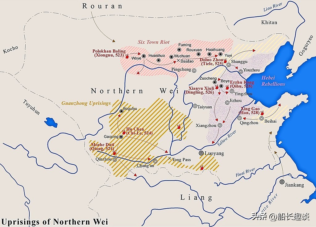 正光五年(524年),北魏爆发六镇之乱,而朝廷征讨不力,导致各地叛乱四起,使得北方局势更加混乱。征东将军尔朱荣则通过镇压六镇叛乱而迅速崛起,成为北魏最有实力的军阀。