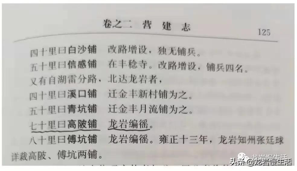按,“高陂铺”在上述三部地方志是作铺名的,也就是说已作为正式的地名了。高陂等铺,是由龙岩县派兵驻守,负责开支,是由龙岩县管辖的。高陂铺(包括湖雷铺)是旧有,不是新设。高陂铺至雍正十三年(1735年)才被龙岩裁撤,其铺司兵也是拨至龙岩各铺。