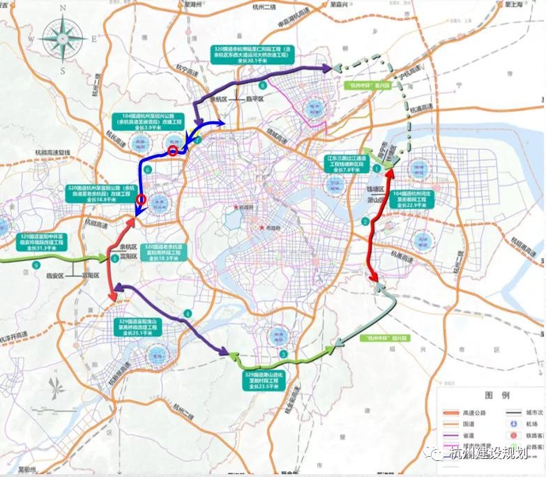 杭州段由9个项目构成,具体为:104国道杭州河庄至衙前段工程、329国道萧山进化至戴村段工程、329国道富阳渔山至高桥段改建工程、320国道老余杭至富阳高桥段工程、320国道余杭(临平)博陆至仁和段工程、320国道杭州至富阳公路(余杭良渚至老余杭段)改建工程、104国道杭州至绍兴公路(余杭良渚至崇贤段)改建工程、江东三路过江通道工程、329国道富阳银湖至临安於潜段工程。
