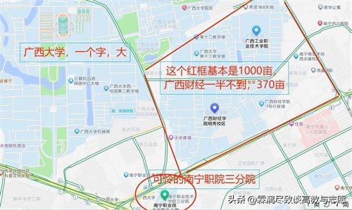 广西财经明秀校区在广西工业职院的南边,2个校区占据了一个大方块。一眼我就猜测这个校区不足500亩。西北方向是广西大学一哥广西大学。广西财政高专的历史说校区在明秀西路100号,广西商专说自己的校区在农院路8号,关键这两条路是那个区块的两条边啊。难道之前两个学校是屁股贴屁股的吗?挤在370亩的小地方办学吗?当然,边上还有委屈巴巴的南宁职院的三分院,和边上的五里亭第一小一样大。370亩,按现在的高校设置标准,办一个大专高职院校都不够。所以,广西人民办学,不容易的,广西的钱袋子,不饱满的。