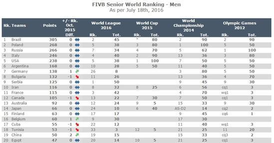 7月18日,伴随着2016年世界男排联赛的结束,国际排联官网更新了最新一期男排成年组的世界排名。中国男排以2016世界男排联赛15个积分、2014世锦赛33个积分以及2012伦敦奥运会的3个积分,已总分50分排名第19位,创历史第2差排名。