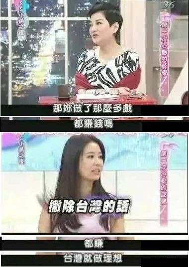 在台湾电视节目上还放言,在大陆拍电视剧就是为了赚钱,在台湾拍摄就是演艺理想。