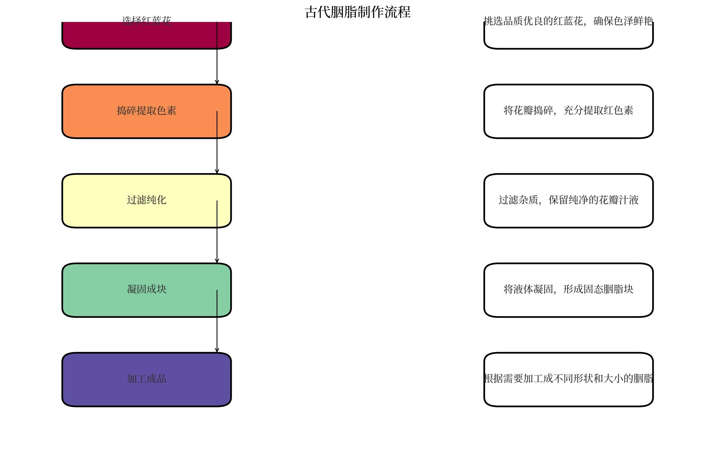 胭脂的制作是古代化妆文化中的一项精细艺术。根据《古代人的日常生活1》中的描述,胭脂的制作流程体现了古代人对美的追求和对工艺的严格要求。以下是胭脂制作的主要步骤及其特点: