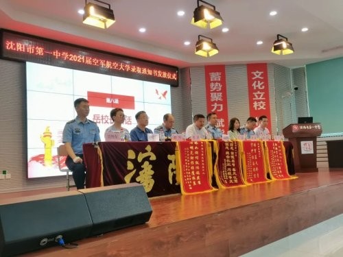 7月12日,为庆祝2021届航空实验班学子在今年高考中取得的优异成绩,沈阳市第一中学举行了辽宁空军青少年航空学校实验班毕业生空军航空大学录取通知书发放仪式。今年,沈阳市第一中学航空实验班共有28人考取空军飞行学员,录取率68.3%,在全国16所空军青少年航校中排名第一。