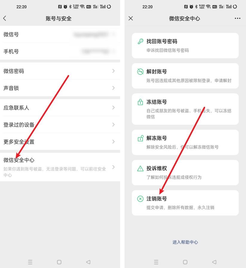 2、在底部找到并点击【微信安全中心】,然后点击【注销账号】即可, 最后根据提示进行注销。