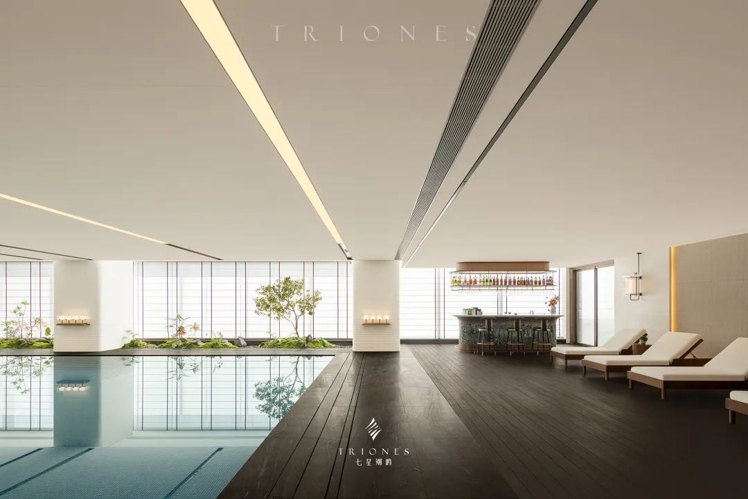 在七星潮鸣的公区,光大堂的面积就有约600㎡,约13米的层高颇有气势,悬浮锦鲤艺术馆,汲取七星帆船酒店灵感,地面、墙面用了各种奢石。项目还专门用了一整层配置了会所,包括茶室、早餐吧、书吧、健身房、度假式泳池等。