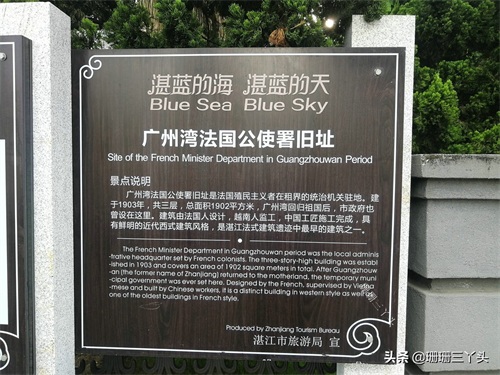 珊珊三丫头最近完成手头上的一个重要工作项目后,决定给自己一个假期,放松一下心情,于是便选择到海滨城市“湛江”旅行。从广州到湛江,我选择了高铁,400多公里,3个多小时的车程。当我来到湛江游玩几天之后,发现湛江有另一个名字:广州湾。地名,是人们赋予某一特定空间位置上自然或人文地理实体的专有名称。地名命名的意义是它是人们为地命名时的着眼点,或者叫命名的因由或理据,包含了一个地方的文化、历史、地理等。为什么湛江又曾被称为“广州湾”?与相距有400多公里的广州是否有关系呢?广州湾包含了这座城市怎么样的故事?为了寻找答案,我决定来到湛江霞山的海滨路的“广州湾法国公使署旧址”参观,因为这里有“广州湾”的历史展,希望在这里寻找到答案。