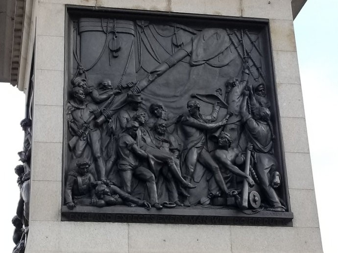 广场中央耸立着高53米的纳尔逊纪念柱,石柱顶端立着的便是纳尔逊铜像。纳尔逊头戴船型三角帽,身穿燕尾军装,左手撑着一柄剑,脚下是一堆缆绳。纪念柱的基座四面嵌有四幅青铜浮雕,反映的是纳尔逊的一生中最为人所熟知的战役:圣文森特角战役、尼罗河战役、哥本哈根战役和特拉法加战役。特拉法加海战的场面。据说雕塑的金属部分就是用缴获的法国海军铜炮铸造成的。