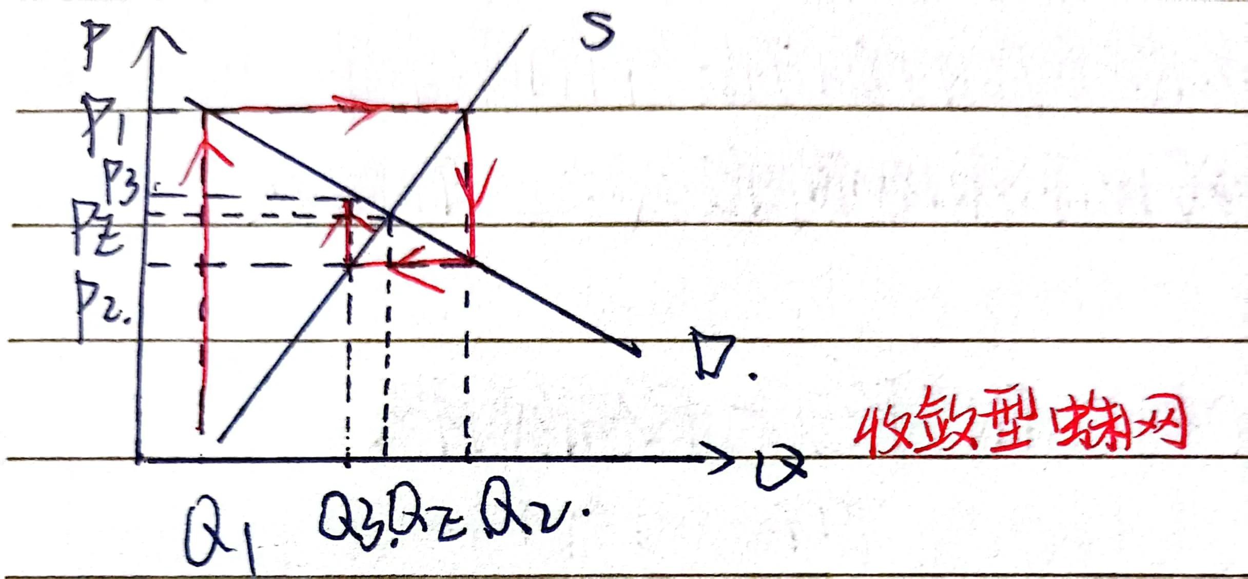 对于Q轴,供给曲线斜率绝对值<需求曲线斜率绝对值,即供给弹性>需求弹性。外力干扰偏离原均衡后,实际价格和实际产量波动幅度越来越大,偏离均衡点越来越远。