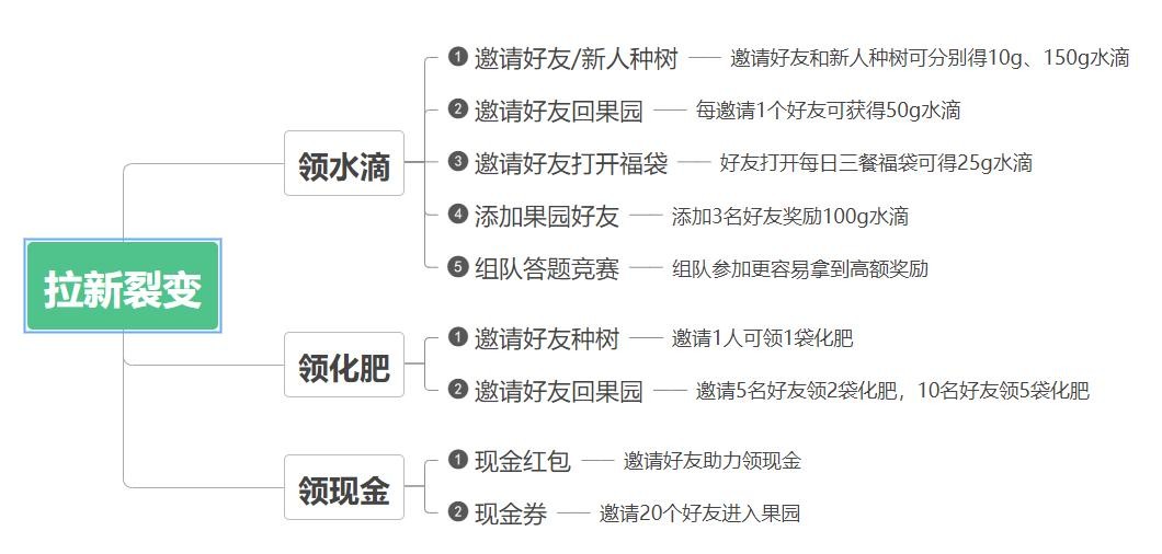 游戏中通过领取水滴设置的分享裂变点主要有以下几个:邀请好友或新人种树,且邀请新用户得到的水滴更多,可得150g水滴;邀请好友回果园和打开三餐福袋,即通过唤醒老用户可得水滴;在好友列表中添加果园好友,以及与好友组队答题,都意味着要把APP分享给好友,好友点击后加入即可得到水滴。