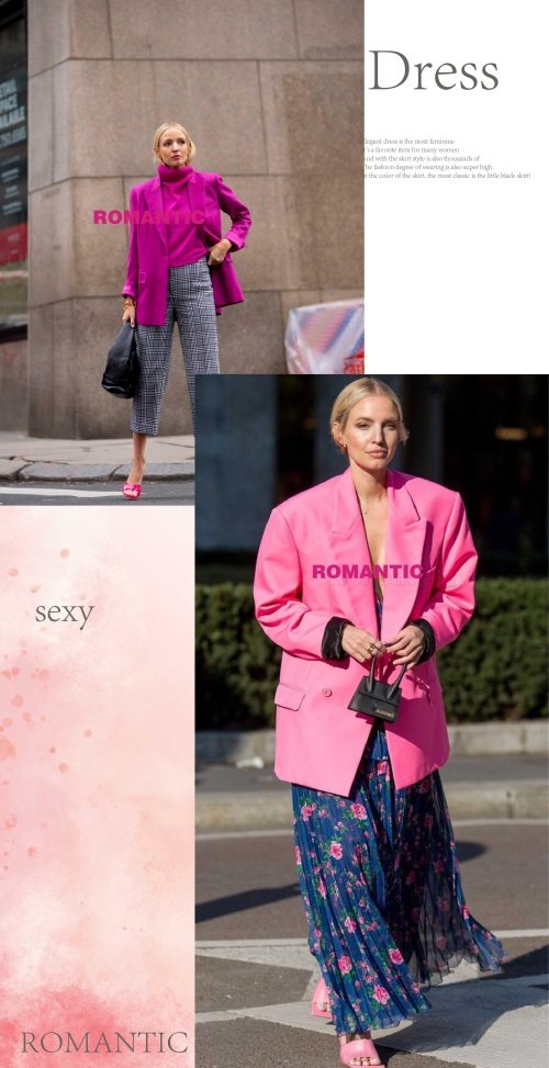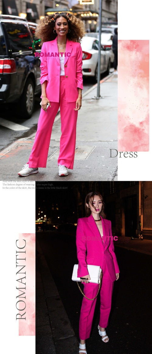 大气简洁的西装造型,时尚优雅,带着正式感,彰显出利落与帅气风范呈现。而采用玫红色来加持,会把西装的正式感减弱一些,带来一些甜美优雅的淑女风情。