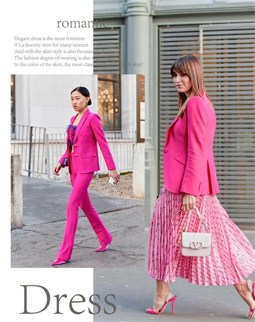 玫红色的单品自身就带有一定的辨识感,而在与其它单品的色系选择上面,可搭配一些比较迷人的色泽,时尚而又显得时髦抢眼。