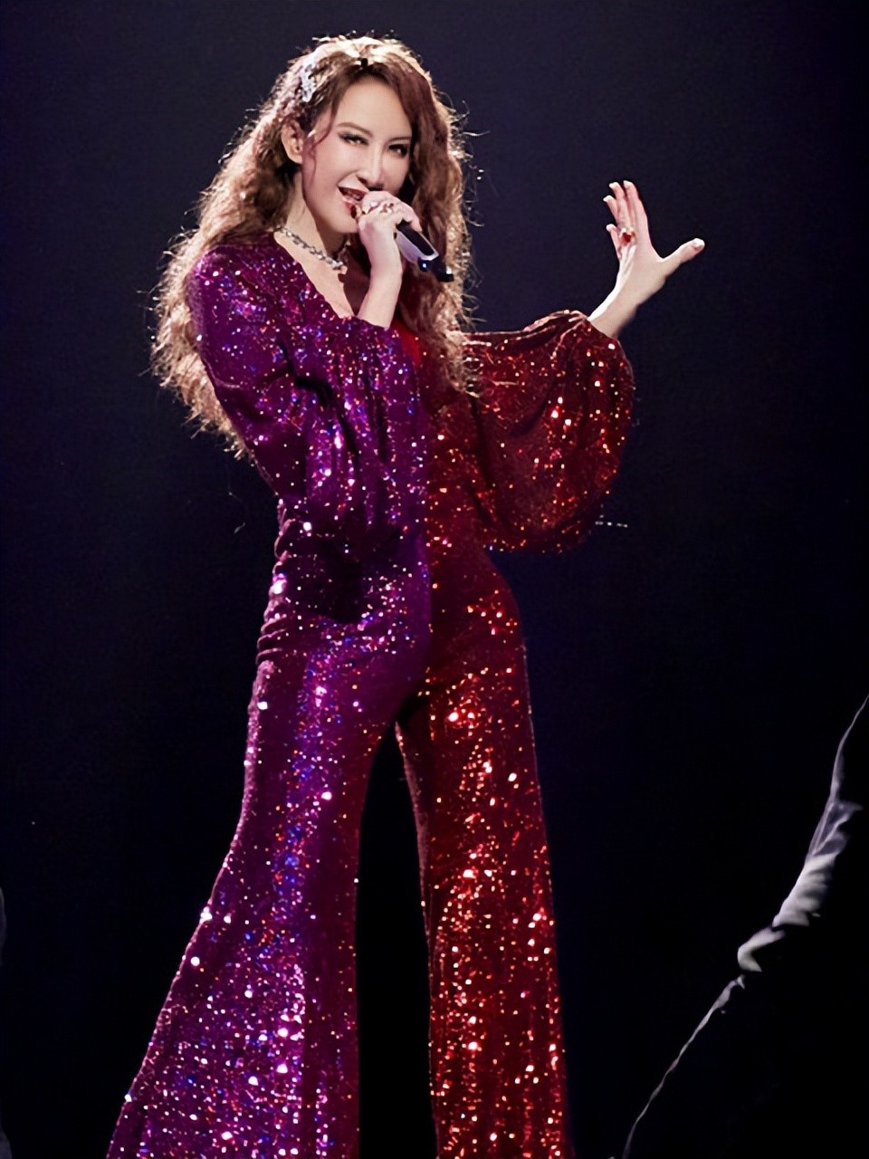 近日,李玟登台湖南台的一档综艺节目《声生不息》,以一套红配紫的连体喇叭裤造型亮相。