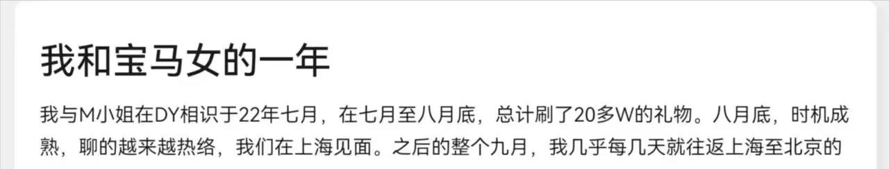 从2023年10月开始,网上出现了一个叫“我和宝马女一年的故事”的账号,这个账号就是马诺丈夫刘先生的。