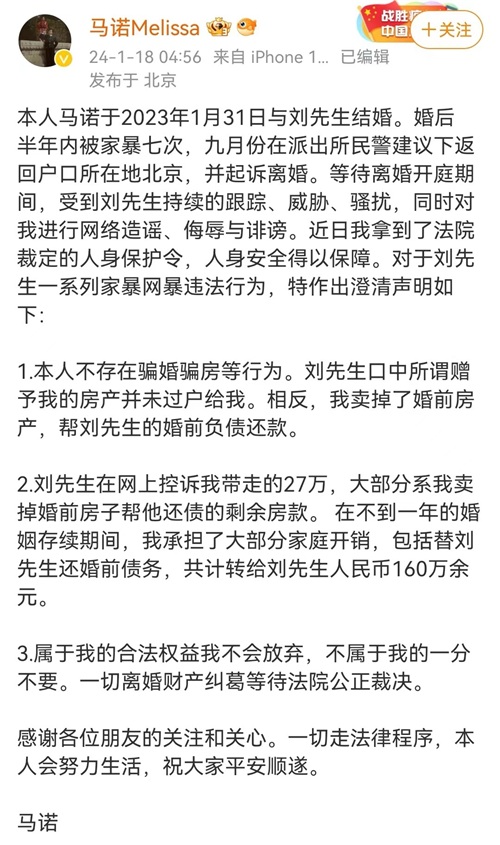 如今,马诺的离婚官司还没有正式盖棺定论,一切都充满了未知数。而至于双方所讲究竟是否是事实,不得而知,然而,有一个细节值得考究。那就是在2023年12月7号,刘某发布了最后一条消息后,直到2024年1月18号,马诺发文澄清谣言后,他再也没有发文反驳。似乎默认了马诺所言非虚。