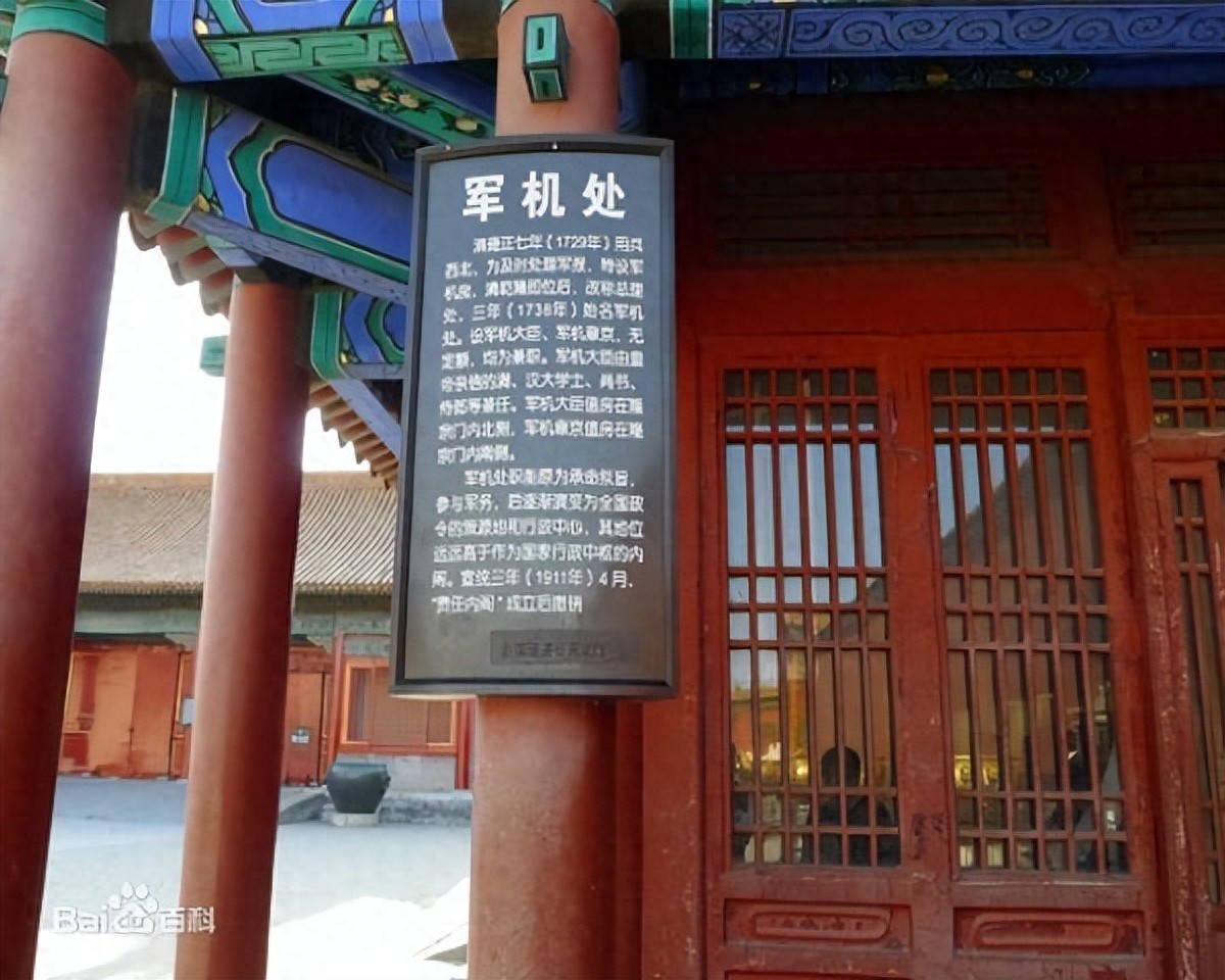 雍正八年(1730)添设军机章京。雍正十年(1732年)移军机房于乾清宫门外,正式更名为军机处,颁定军机处印信。办公处所,称值庐。军机处是有官无吏的特殊衙门,在军机处任职的,无定员,最多时六七人。由皇帝从亲王、内阁大学士、六部尚书、侍郎或京堂(院、寺等衙门长官)中特简选拔人员入职,称为军机大臣,通称大军机。