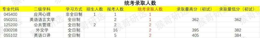反观统考录取人数偏低的专业,全日制的英语语言文学、公共管理、外交学、英语口译、非全日制的应用心理均小于3人,整体录取偏低。