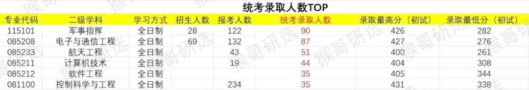 从统考录取人数来看,全日制的军事指挥、电子与通信工程、航天工程、计算机技术、软件工程、控制科学与工程专业人数均较多,属于重点招生专业,其中军事指挥人数位于榜首,录取人数为90人。此外,根据现有数据显示军事指挥、电子与通信工程专业统考录取人数均大于招生人数,有扩招迹象,考生可根据自身的情况进行选择。